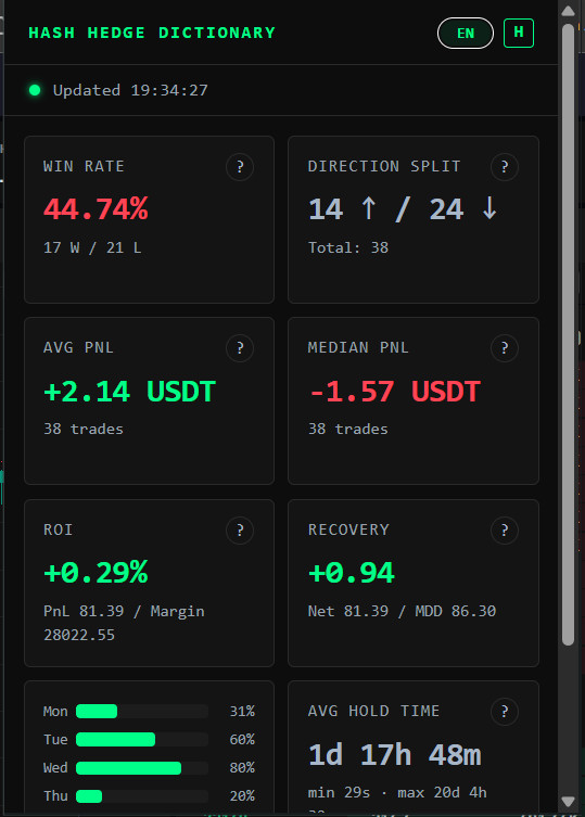hash-hedge-chrome.zip using the Download button above.chrome://extensions in Chrome.manifest.json.hash-hedge-firefox.zip using the Download button above.about:debugging in Firefox address bar.manifest.json from the extracted folder.Hash Hedge Diary automatically collects your closed trade history from Hash Hedge, applies smart filters, and calculates key performance metrics including win rate, ROI, recovery factor, average hold time, and profit consistency. The popup gives you a fast performance snapshot so you can review your decisions and improve your trading process over time.